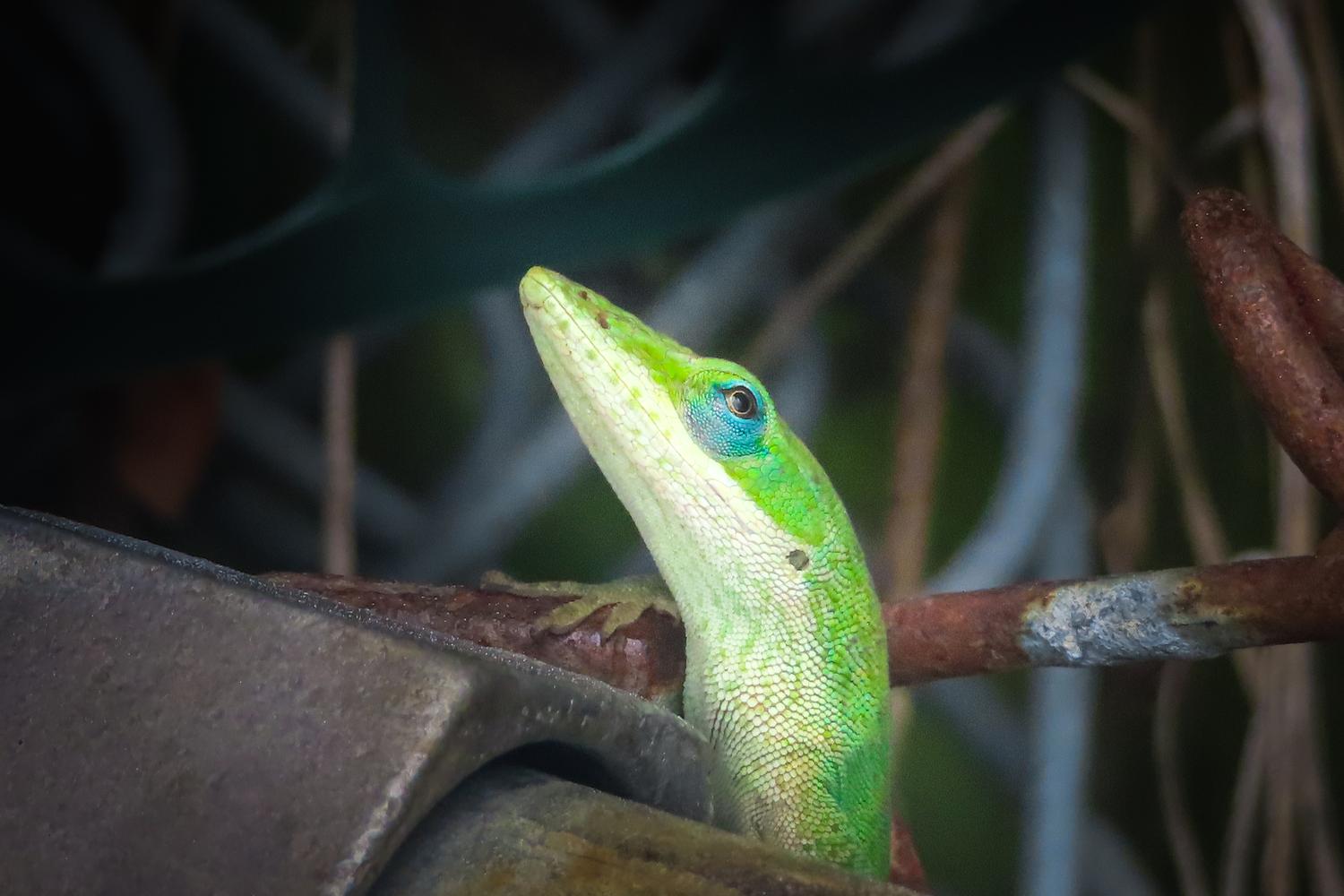 Green anole with blue eyeliner—Lens: Canon Powershot SX740 HS 24-960mm—ISO: 400; @ 29.137mm; f/5.6 at 1/400sec.