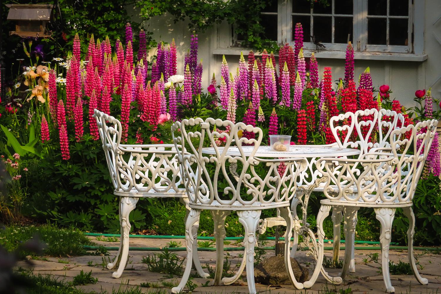 Cottage Garden White Outdoor Furniture with Lupins